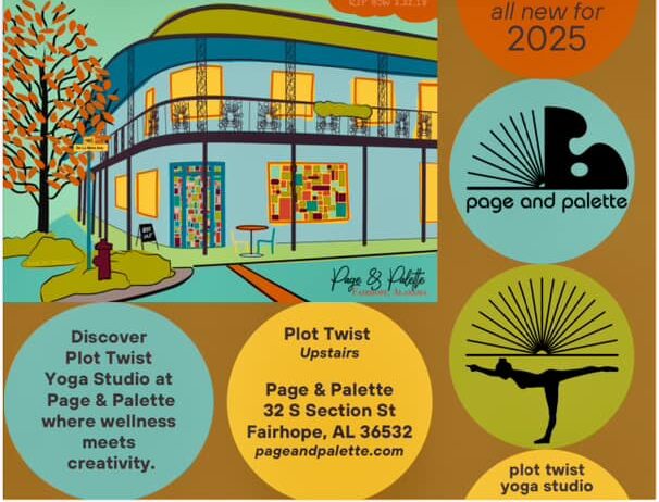 Group yoga classes are offered at Plot Twist Yoga Studio located upstairs at Page & Palette 32 S. Section St. Fairhope, AL 36532